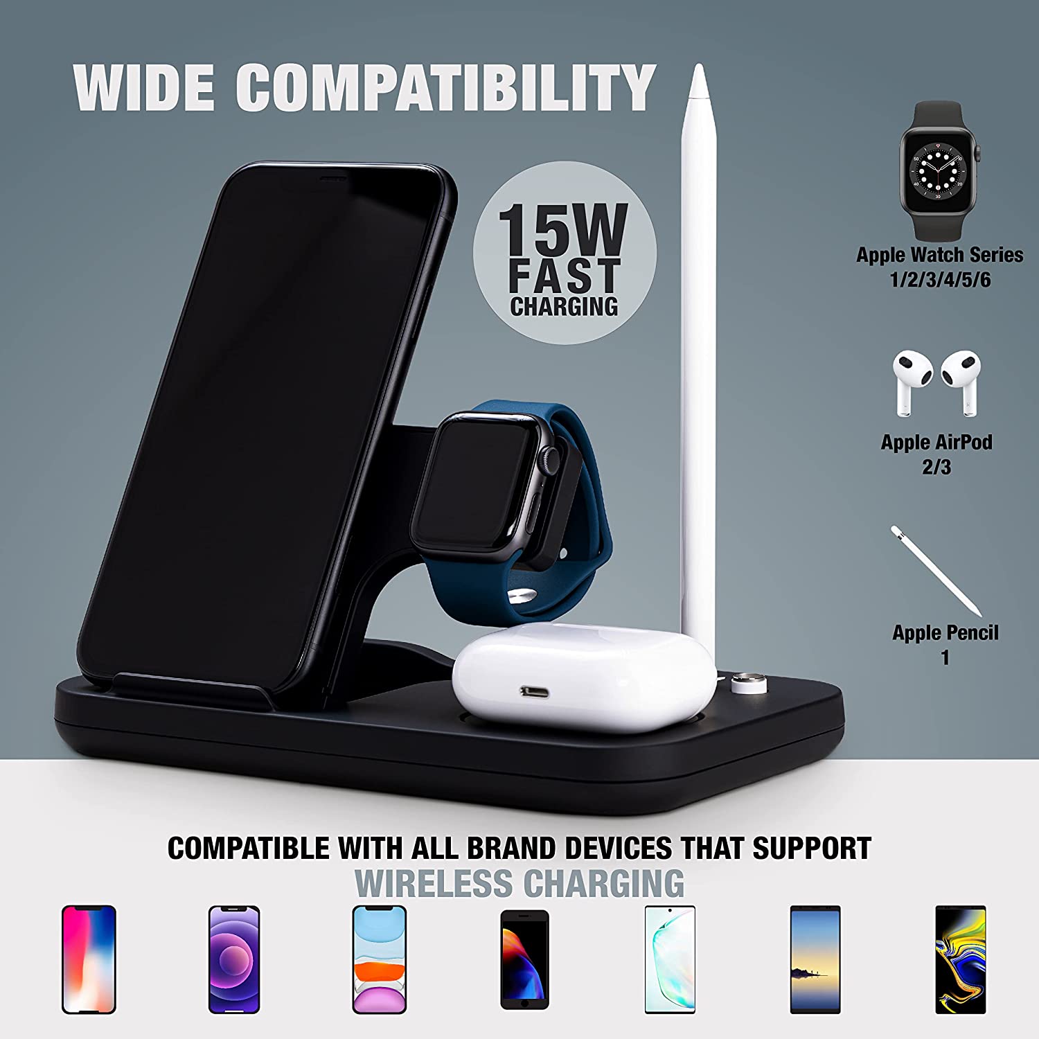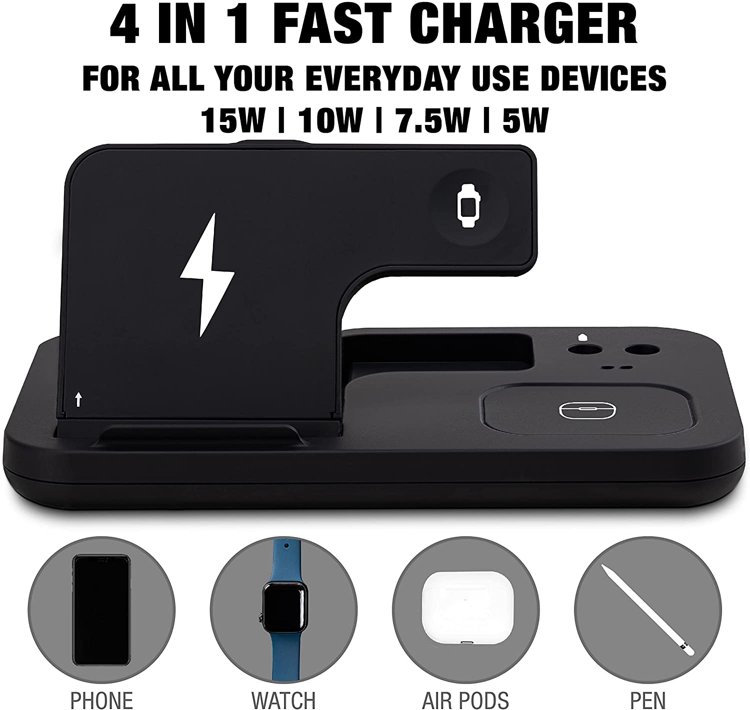 - 1 year warrant and CE, RoHS, Qi certified. Ideal for iPhone, Apple Watch, AirPods, and Apple Pencil.
