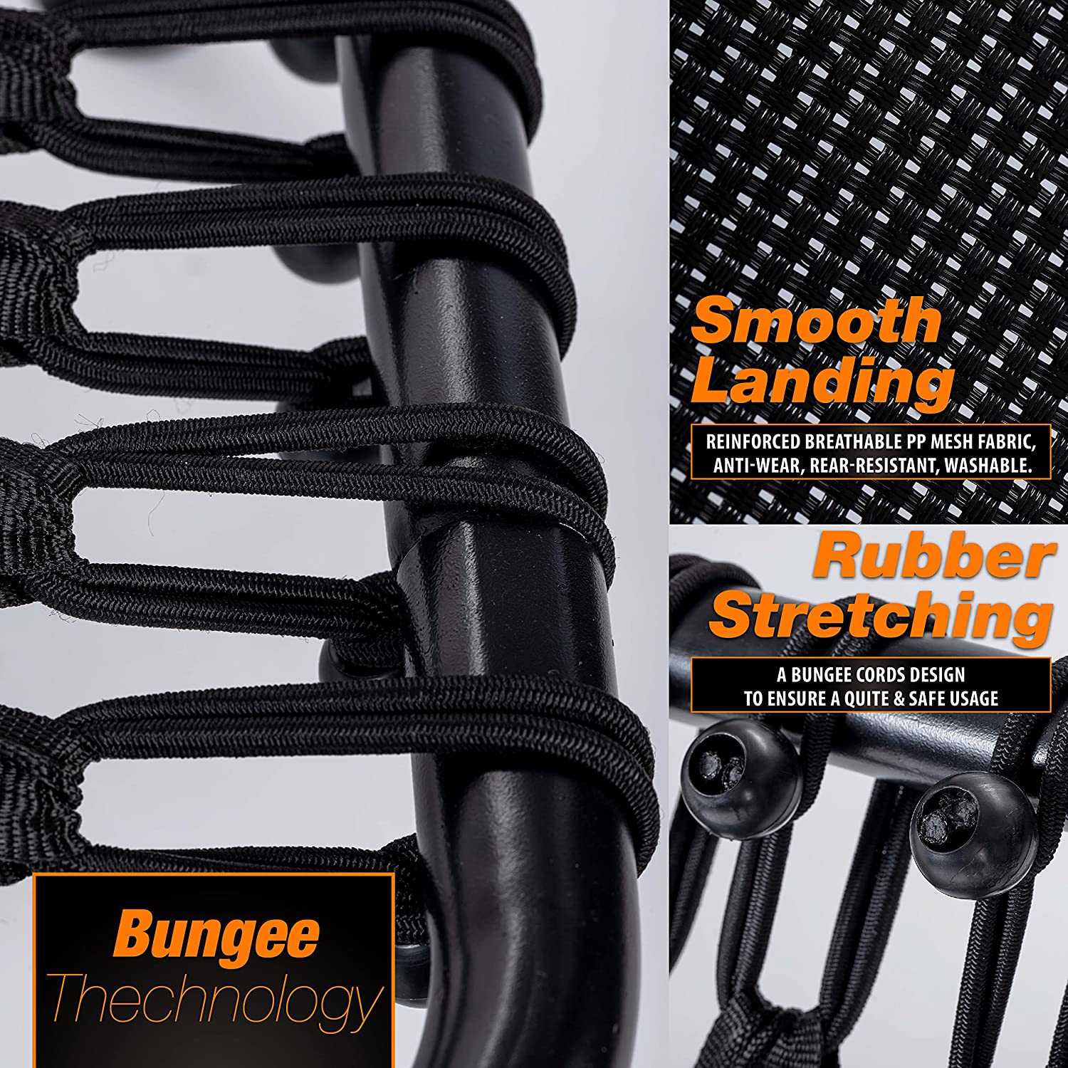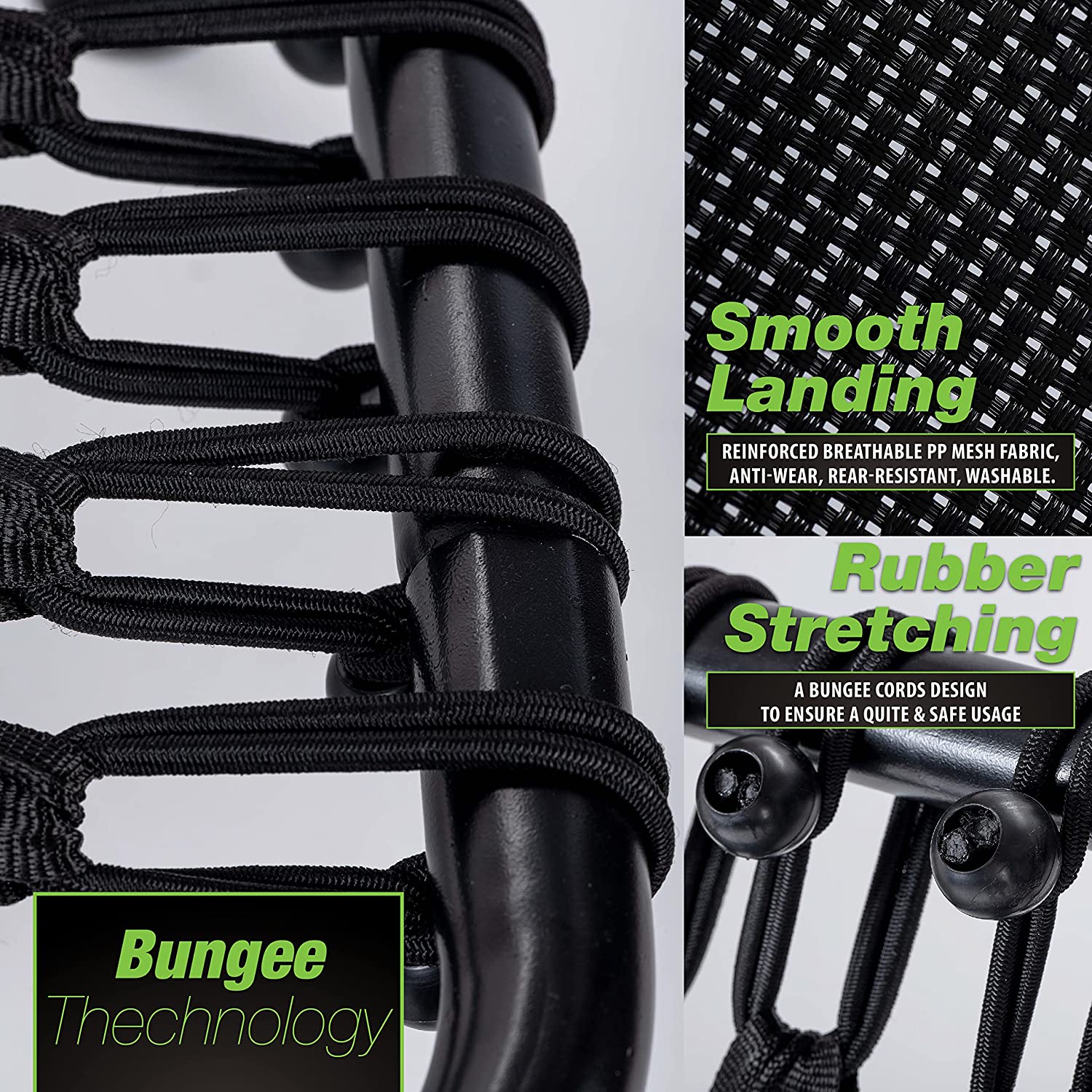 - 53-inch frame provides a large surface area with lots of freedom to move. Virtually silent and wonderfully smooth, cushioned, yet lively bounce